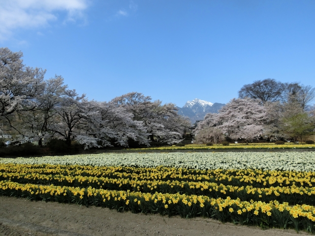 「実相寺」には、神代桜だけではなく、境内に30本ほどのソメイヨシノのほか、全国各地の名桜の子桜も花を咲かせています。10万株の水仙のやわらかな黄色と桜、そして雪を頂いた南アルプス連峰の青と白。「実相寺」の境内からは、コントラストも鮮やかな春の風景を目にすることができます。
