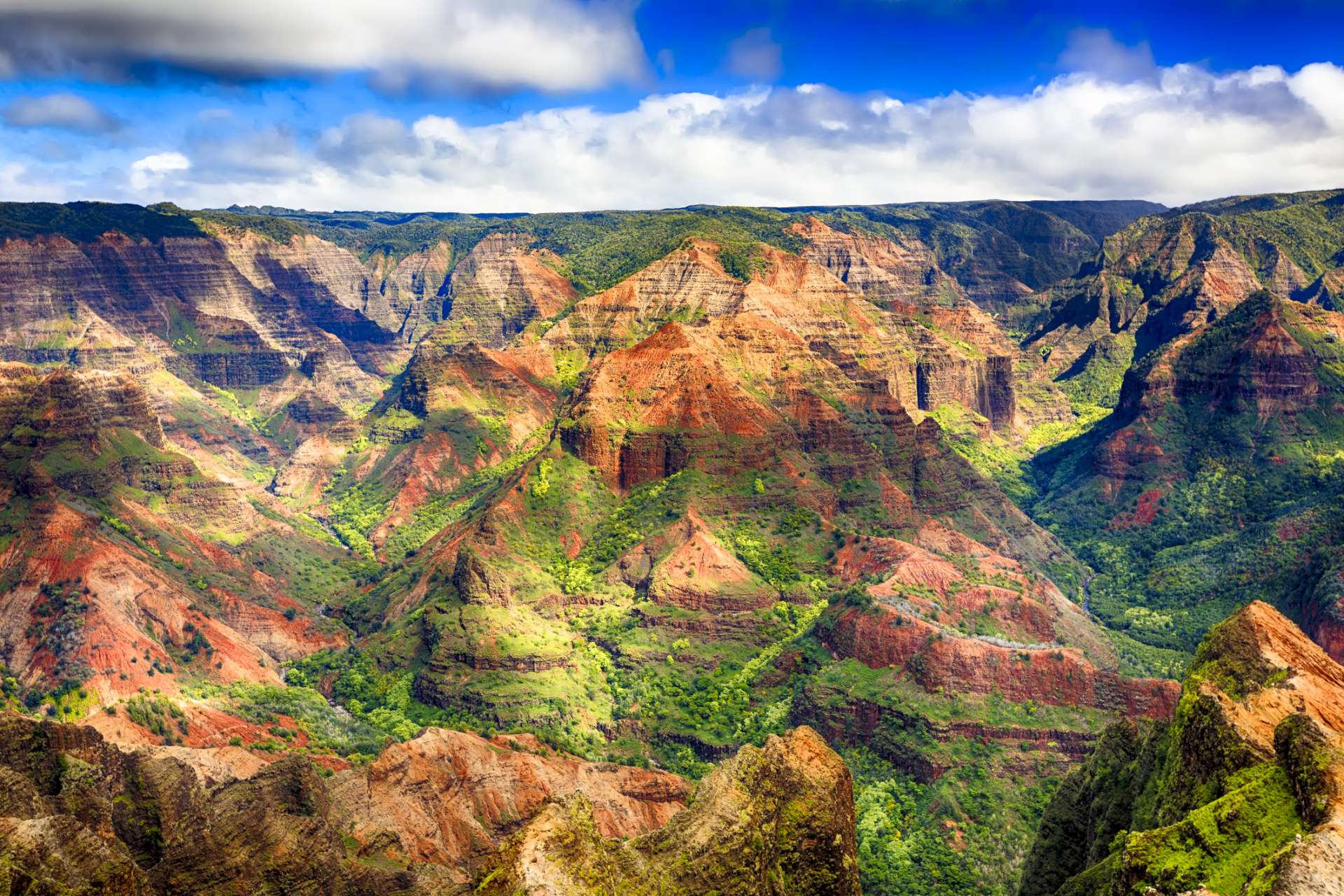 最後はかのマーク・トウェインが「太平洋のグランドキャニオン」と評したワイメア渓谷。ワイルドな赤茶色の岩肌は、数百万年という果てしなく長い年月をかけて雨や風で少しずつ削られてでき、そのまわりを深い緑が覆っています。ワイメア渓谷展望台に立ってみると、まるで渓谷に囲まれているような気分になり、大地や地球の壮大さに息をのんでしまうはず。まさに地球の裂け目を体感できる場所に立ってみてください。ただし世界でも有数の多雨地帯といわれるカウアイ島だけに、急に雨雲が出てザーっと降られることは日常茶飯事。天候に恵まれるかは、運次第かも!?