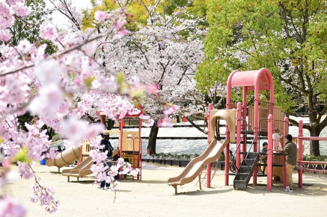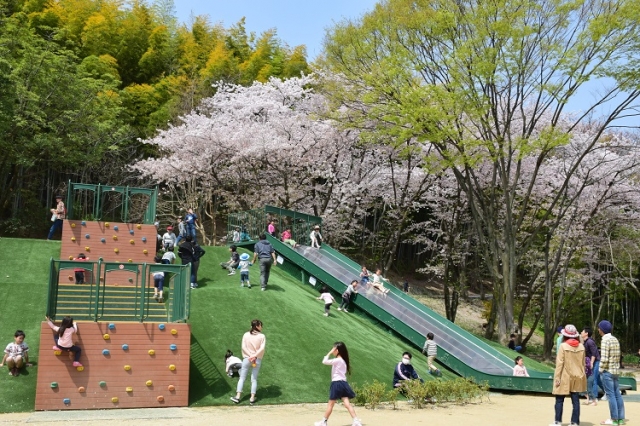 服部緑地の北東端にあるいなり山児童遊戯場は、お子さまのいるファミリーがお花見をするのに最適の場所です。2018年の春に遊具が新しく整備されましたので、安心してお子さまを遊ばせることができます。