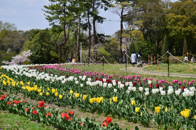 桜と合わせて見ることのできるのがチューリップです。服部緑地の中央にある円形花壇に植えられています。また、小さくて白い花がかわいらしいユキヤナギのトンネルも見どころです。都市緑化植物園でも何種類ものチューリップが咲きますので、お見逃しなく。