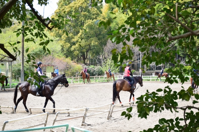 服部緑地には乗馬センターがあり、タイミングがよければ乗馬のレッスンを見ることができます。小学生からレッスンに通えるそうです。馬が驚いてしまいますので、見学するときは静かにそっと見守ってください。