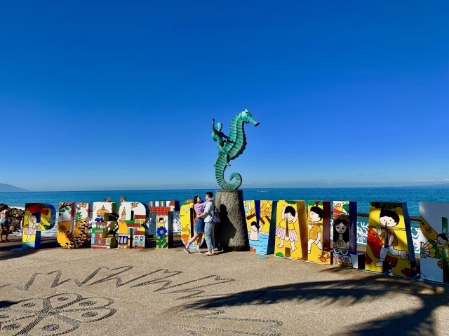 街のシンボルマークであるタツノオトシゴをモチーフにした「シーホース・モニュメント(Seahorse Monument:Momento El Cabalito)」の前には、記念写真の列が途絶えず……。のんびりと待っていてはいつまで経っても撮れませんので、合間を見計らって、勇気をだして撮りにいきましょう。