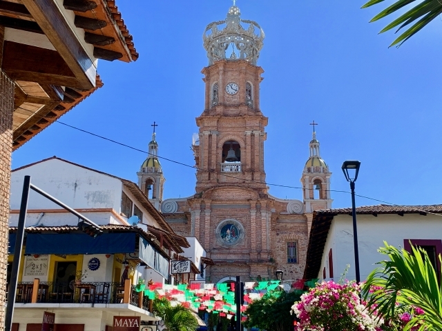 モニュメントの反対側には市庁舎があり、そのまま山側に向かって1ブロック歩くと、美しい空に映えた「グアダルーペ寺院(Our Lady of Guadalipe)」があります。荘厳で堂々とした趣ですが、青空に馴染んでとても鮮やかで、ラテンの雰囲気いっぱいの外観です。ここもプエルト・バヤルタの「ザ・観光地」といえるでしょう。