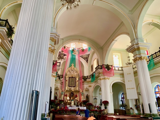 真っ白な寺院内には、至る所にメキシコのフラッグカラーがあり、ここもインスタ映え間違いなしです。解放感があり、色鮮やかな空間ですが、対照的に人々は静かに祈りを捧げています。改めて敬虔なるカトリックの国というのがわかります。