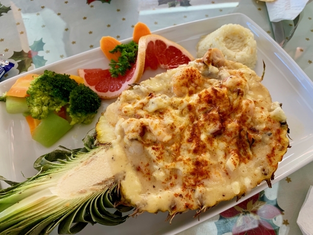 こちら(上の写真)は、真っ二つに切ったパイナップルにたっぷりのシーフードを詰めたグラタン料理(210ペソ)です。シュリンプがたっぷりで、ソースは軽めです。あっさりしているパプリカのアクセントが食欲をそそります。