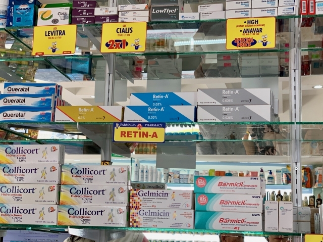 どこのファーマシア(Farmacia・薬局)でも売っていたシミ取りクリーム「レチンA(Retin-A®0.1%)」は、レアなアイテムです。アメリカでは、含有0.1%は処方箋がないと買えないそうです。1本580ペソで、3本買ったら550ペソにしてくれました(すごい割引率!)。