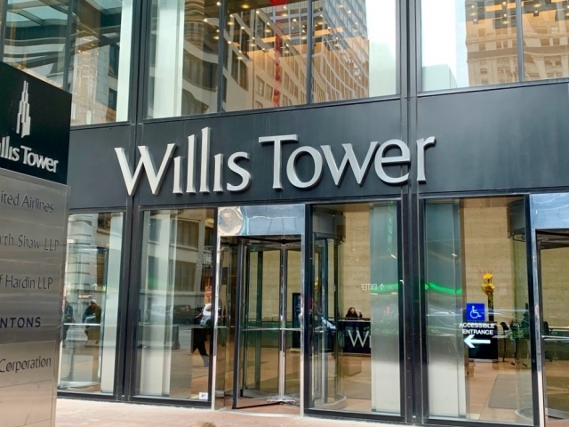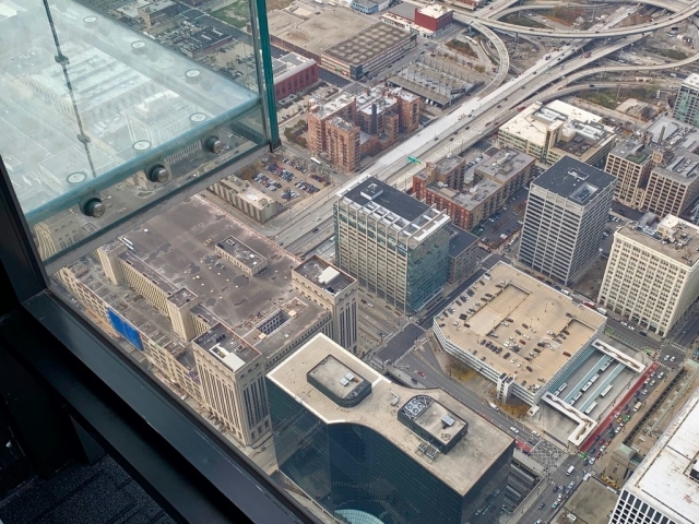 次に紹介するアクティビティーは、スカイデッキ・シカゴの「ザ・レッジ(The Ledge)」です。アンテナまでつけて何とか世界一の高さにしたかっという高層ビル、ウィリス・タワー(Willis Tower)。1998年にクアラルンプール(マレーシア)のペトロナスツインタワーができるまでは世界一の高さでした。