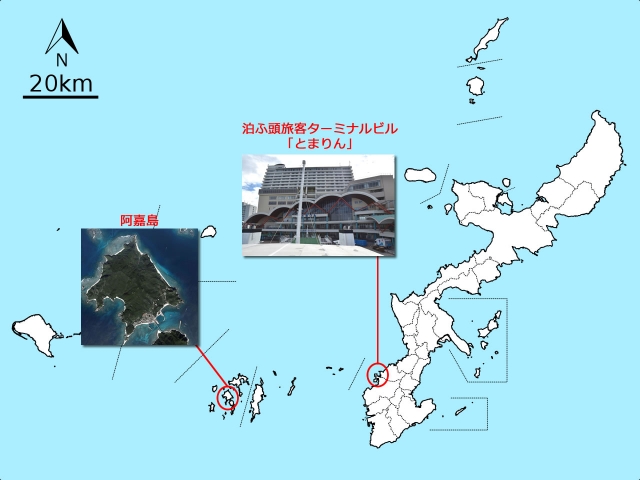 阿嘉島へのルートは2通りあります。ひとつは、那覇の沖縄都市モノレール「ゆいレール」の美栄橋駅から徒歩約10分の大通り沿いにある旅客ターミナル「とまりん」より毎日出港している『フェリーざまみ』に乗船し、阿嘉島で下船。料金は往復4,030円(大人1名)、もう一つは、座間味島と阿嘉島を結ぶ1日4往復している村内航路「みつしま」を利用する手段です。料金は大人片道300円、15分ほどの船旅です。