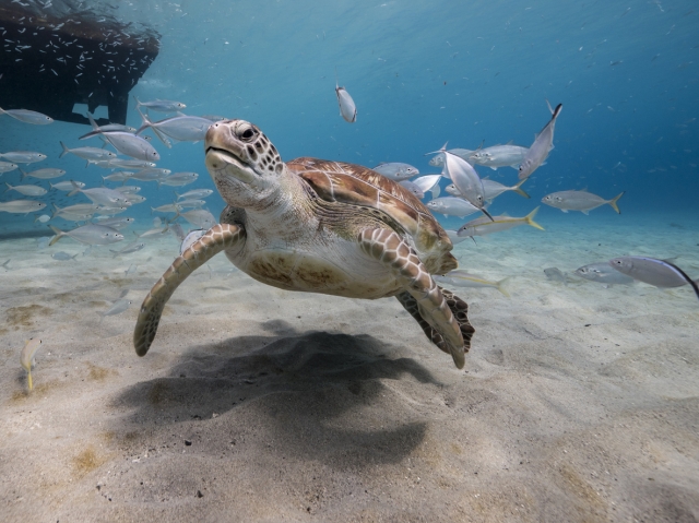 座間味島、阿嘉島に来遊するウミガメは、アオウミガメ、アカウミガメやタイマイが主な種類です。5月~9月の中潮と大潮の夜の満潮時には、砂浜に上陸している姿も散見されます。