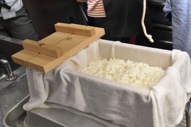 沖縄の伝統的な豆腐、”ゆし豆腐”(島豆腐)。普通の豆腐と違って。生呉(なまご)と呼ばれる、磨砕された大豆を加熱する前の段階でおからと豆乳を分離する生しぼりをおこなう製法が、伝統的な島豆腐の特徴です。その後、海水やにがりを加えた状態で、ふわふわしたものが”ゆし豆腐”です。阿嘉島にある、ゲストハウス すまいるでは、この”ゆし豆腐”を大豆を磨砕する工程から実際に体験できるプログラムがあります。