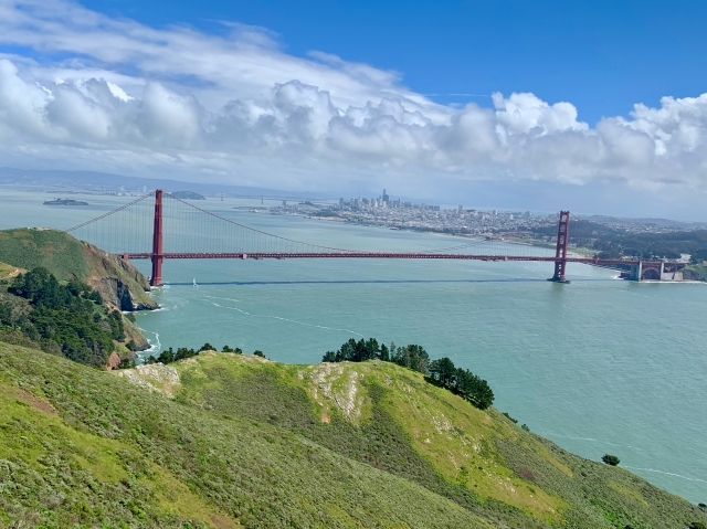 まずは、少し離れた所から「ゴールデンゲート・ブリッジ」の全貌を眺めてみましょう。「マリン・ヘッドランド(Marin Headlands)」は、橋とサンフランシスコの街並みを一望できるビュースポットで、地元の人達にとっては人気のハイキングコースになっています。あちらこちらに大砲台の跡があり、かつて軍事拠点だったことを知ることができます。