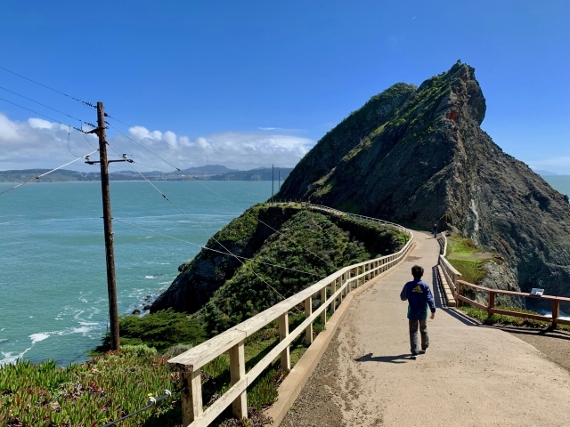 ポイント・ボニータ岬(Point Bonita)に向かって走り始めた男の子。