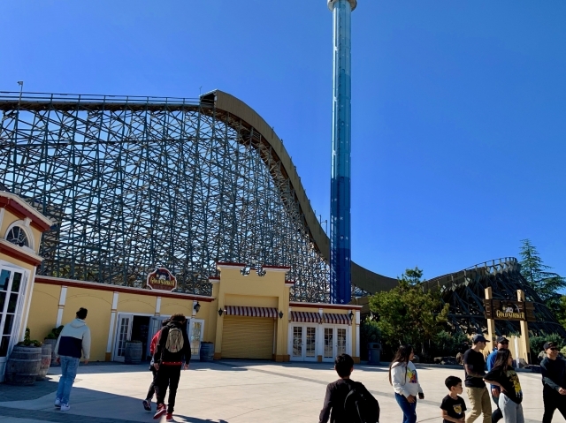 軋みと音がすごい木製ジェットコースターは、「カリフォルニアズ・グレートアメリカ」の人気アトラクションです。訪れた日は、待ち時間なしの2回連続で体験することができました。子供達はもっと乗りたそうでしたが、付き合わされる大人の方がギブアップ!