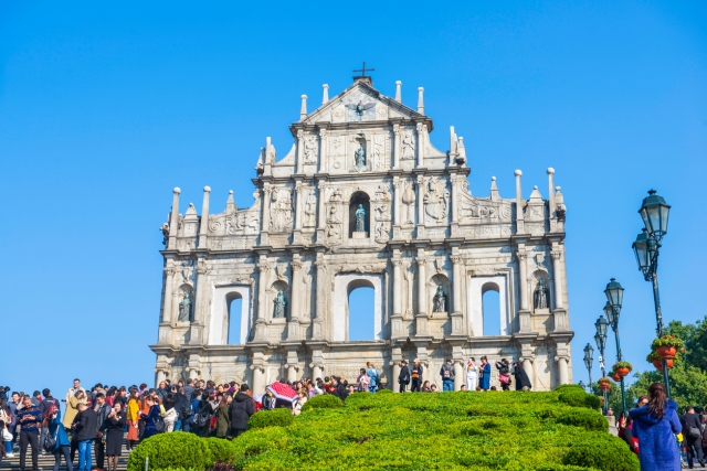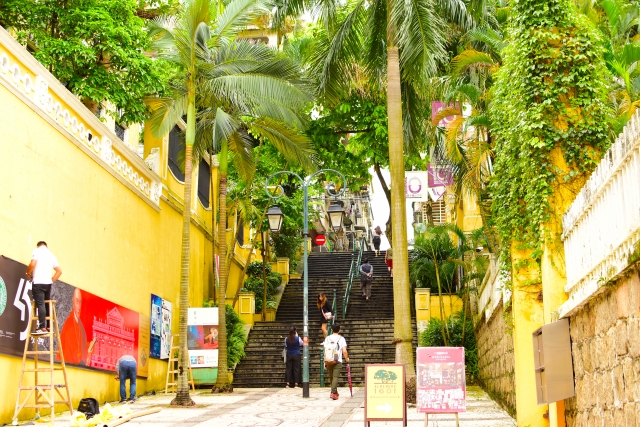 マカオを象徴する観光遺跡「聖ポール天主堂跡」は、かつて東洋一壮大な教会と言われていたましたが、1835年の火災で焼失し、建物正面のファサードと階段壁の一部が残っています。グリーンの植え込みと街灯を入れて撮影すると建物がより映えますよ。
