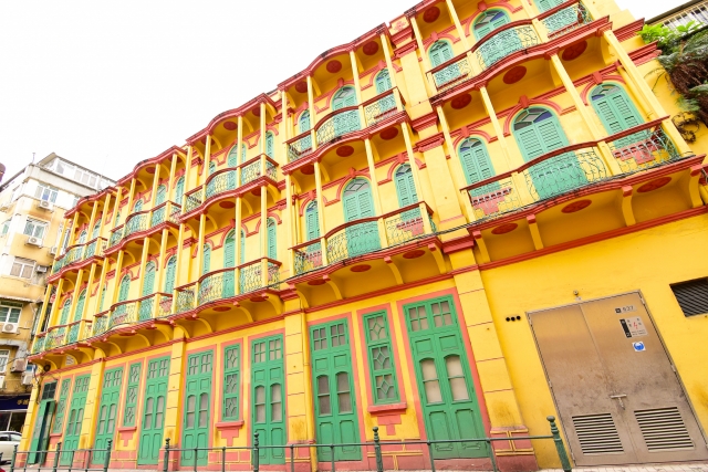 黄色の外壁に緑の窓枠という美しいポルトガル建築が目をひく「荷蘭園商業中心」という建物は、ラザロ地区を象徴する美しい景観を作り上げています。