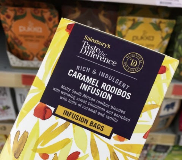 こちらで展開されているキャラメル風味のルイボスティー(Caramel Rooibos Infusion)は、通常、酸味のあるルイボスティーに濃厚なキャラメルを香りとして組み合わせるという斬新さが特徴で、パッケージも有名ブランドに引けを取らないオシャレさです。