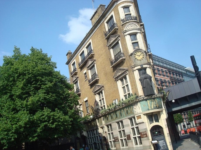 地下鉄ディストリクト線とサークル線が停車するテムズ河畔の駅に、ブラックフライアーズ駅(「黒装束の僧侶」)があります。そもそもの由来は13世紀、この場所にドミニコ修道会の僧院があったから。彼らは黒い僧衣をまとっていたため、ブラックフライアー(黒衣の僧侶)と呼ばれていたのだそう。そんなユニークな歴史にならって、約100年前に出来たこのパブも「ザ・ブラックフライアー」と名付けられました。(地球の歩き方ヒースロー特派員ブログより)