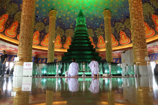 まるで天上世界のような幻想的な世界が広がる寺院。「ワット・パクナーム」はバンコク中心部からBTSとタクシーやトゥクトゥク、ボートなどに乗って約30分くらいで行くことができ、「美しすぎる寺院」として話題です。こちらの寺院は、アユタヤー王朝時代に建立された、高僧・故テムニー師にゆかりがある第3級王室寺院。そんな由緒ある寺院に鎮座する、高さ80mの白い大仏塔5階にあるエメラルド色のガラス仏塔や極彩色の天井仏画は、誰もが圧倒される美しさです。