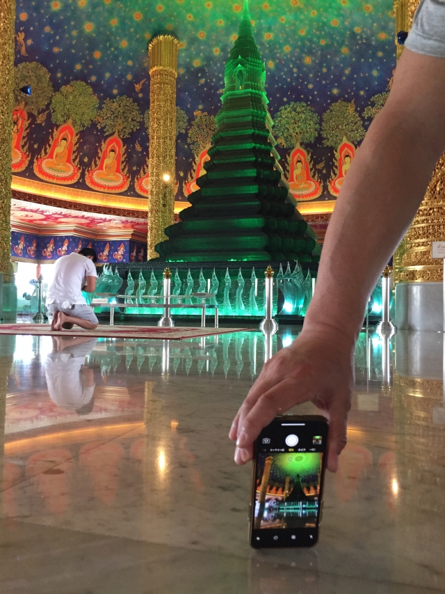 この空間をフレームいっぱいにおさめるにはちょっとしたコツを知っていればOK。スマホを床ギリギリまで下げて、さらに逆さにしてシャッターが上部に来るように(写真参照)。そのようにレンズを床に極力近づければ、より広い空間を捉えることができ、迫力ある一枚になります。そのほかにも仏塔は入れず天井画だけに寄って撮影するのもGOOD! カメラロールが鮮やかなエメラルドグリーン一色になって、写真を眺めるだけでうっとりします。