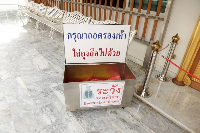 ここでちょっとした注意点を。最近はSNS映えスポットとして人気の寺院ですが、格式高い王室寺院なので、大声で騒いだり、撮影に夢中になって、参拝や瞑想をしている人の妨げにならないように気をつけましょう。またタンクトップに短パンなどの露出の多い服はNG。仏塔や本堂内では靴を脱ぎますが、敷地内を歩くときはサンダルなどは避け、かかとのある靴で行きましょう。とはいえ、仏塔内は冷房が効いていないので、暑期は蒸し暑い! 風通しのよい服がおすすめです。