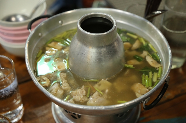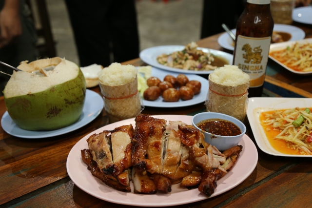 メニューは豊富にあり、パッタイ(タイ風焼きそば)が80B、ラープ・ガイ(鶏ひき肉をハーブやスパイスであえたサラダ)が70B、カイ・ヤーン(たれに漬け込んだ丸鶏を遠火であぶり焼きにしたもの)が100Bなど、どちらもお手ごろ価格です。特にラープは大きめに挽いた鶏肉が食べ応えバツグンで、くせになるおいしさ。イーサーン料理はココナッツミルクをあまり使わず、塩辛い料理や激辛料理が多く、ビールがどんどん進んじゃいます!