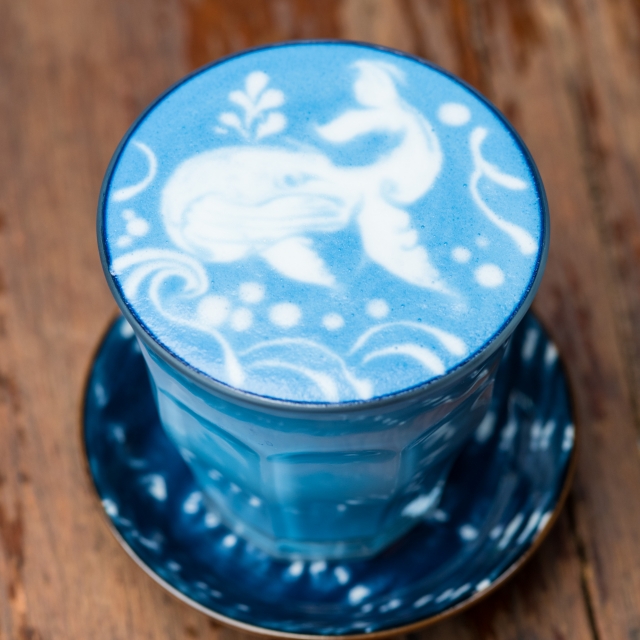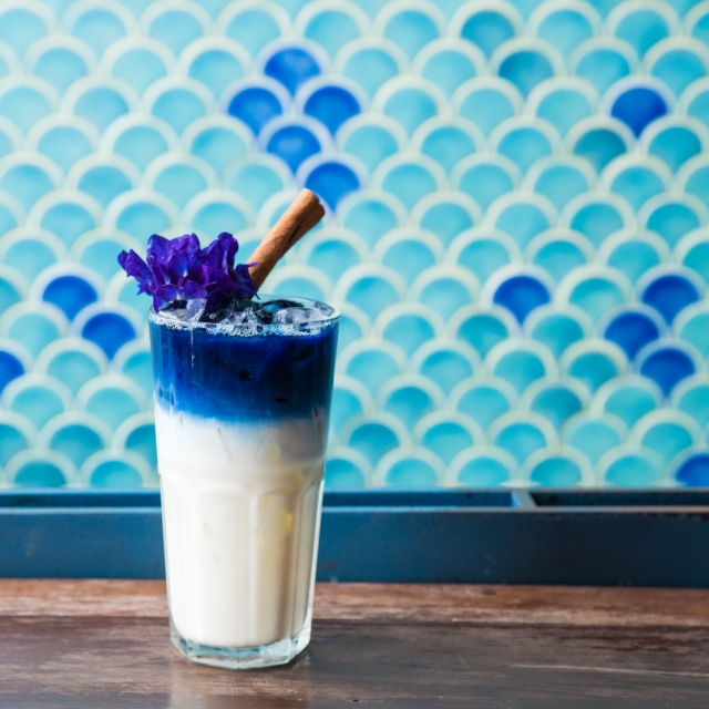 次にご紹介するのも今人気のスポットのひとつ。バンコクに来たのなら一度は見ておきたい三大寺院のうち、ふたつ(ワット・プラケオ、ワット・ポー)のそばにある「ブルー・ホエール・マハーラート」は、バタフライピーという豆科の花を使ったラテとラテアートが話題のカフェです。バタフライピーとはタイ原産の植物で、タイ語でアンチャンと言います。見た目が美しいだけでなく、美肌や美髪、アンチエイジング効果も期待できるんです。