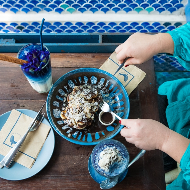 まずオーダーしたいのは真っ青なブルーのグラデーションが涼しげなアイス・バタフライピー・ラテ(120B)。バタフライピー自体に味や香りはなく、ドリンク自体は優しい甘さ。ホット・バタフライピー・ラテ(90B)のラテアートもきれいなので、「冷・温」一緒にオーダーして飲み比べ&写真を撮りましょう。ココナッツアイスのブルー・ホエール・アフォガート(180B)、ピーナッツバターとバナナのトースト(160B)などのメニューもおすすめ。