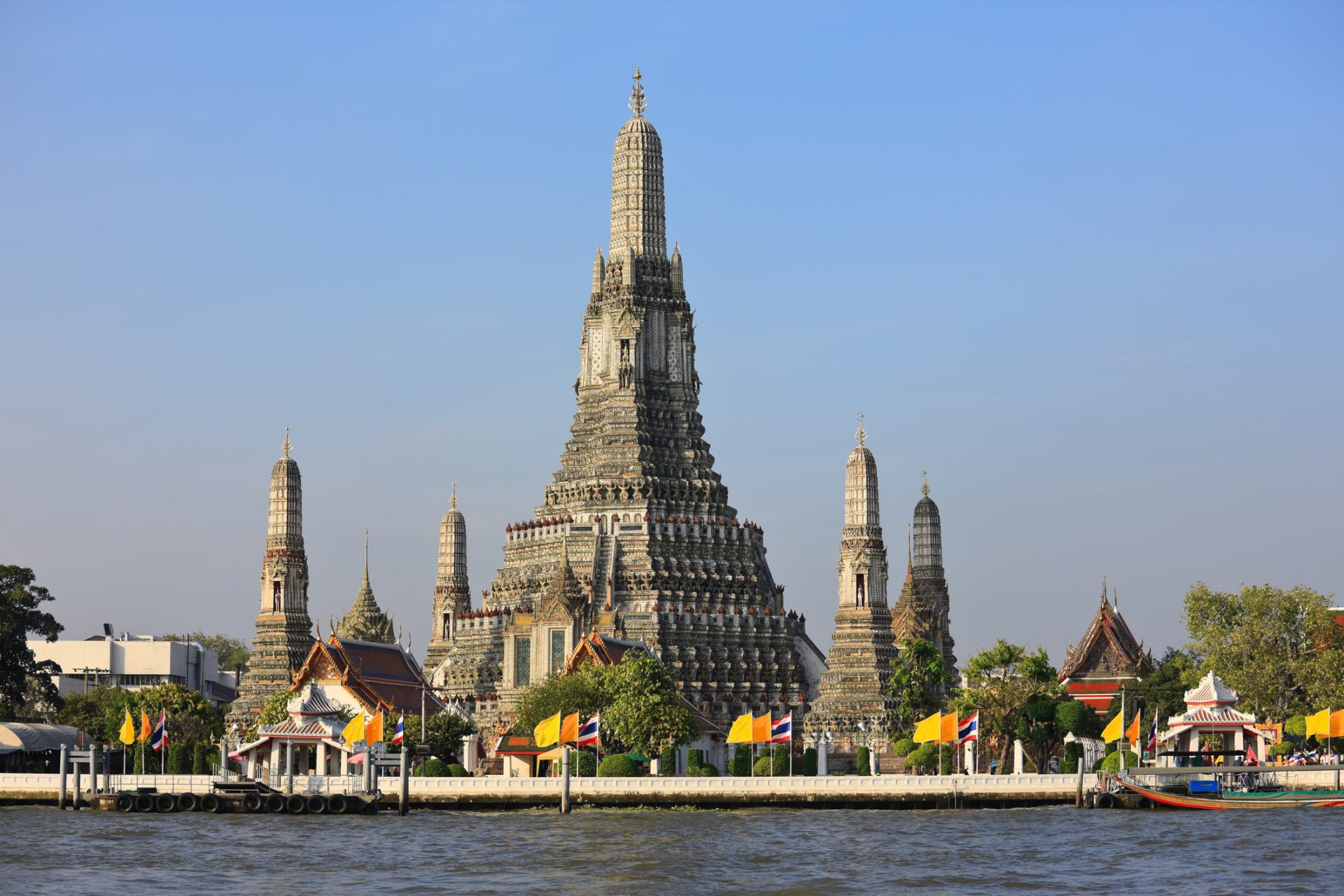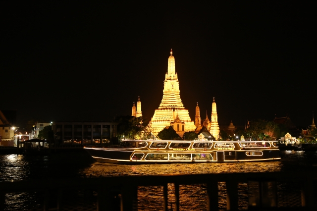 「ブルー・ホエール・マハーラート」のすぐそばを流れるチャオプラヤー川。その対岸にはクメール様式の仏塔「ワット・アルン」がそびえます。暁の寺とも呼ばれ、2017年に改装工事が終了したばかりで創建当時の美しさがよみがえった寺院です。白く光る日中の姿も美しいですが、夜のライトアップの美しさは格別。ライトアップは徒歩観光でも楽しめますが、おすすめはルーフトップレストランで夜景と美食を一度にのんびり楽しむ方法です。