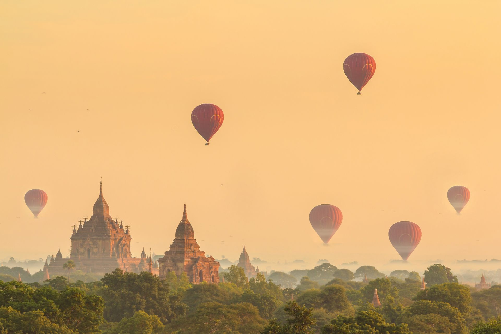 幻想的な霧に包まれる朝、光に照らされ木々の間からニョキニョキと姿をあらわす古い仏塔群と、青空に無数に散らばるカラフルな気球。そして、遮るもののない空から眺める大きな大きなサンライズ。夢のような景色が目の前に広がります。