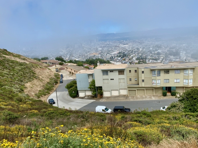 ミュニバス(#37)で、15分ほど、住宅地の間の坂道を上っていきます。74Crestine Drのバス停で下車します。車内の表示は、Twin Peaksと出ていました。ここで、バスのドライバーが道路の反対側を指し、「あの階段を上っていくだけだから」と教えてくれました。