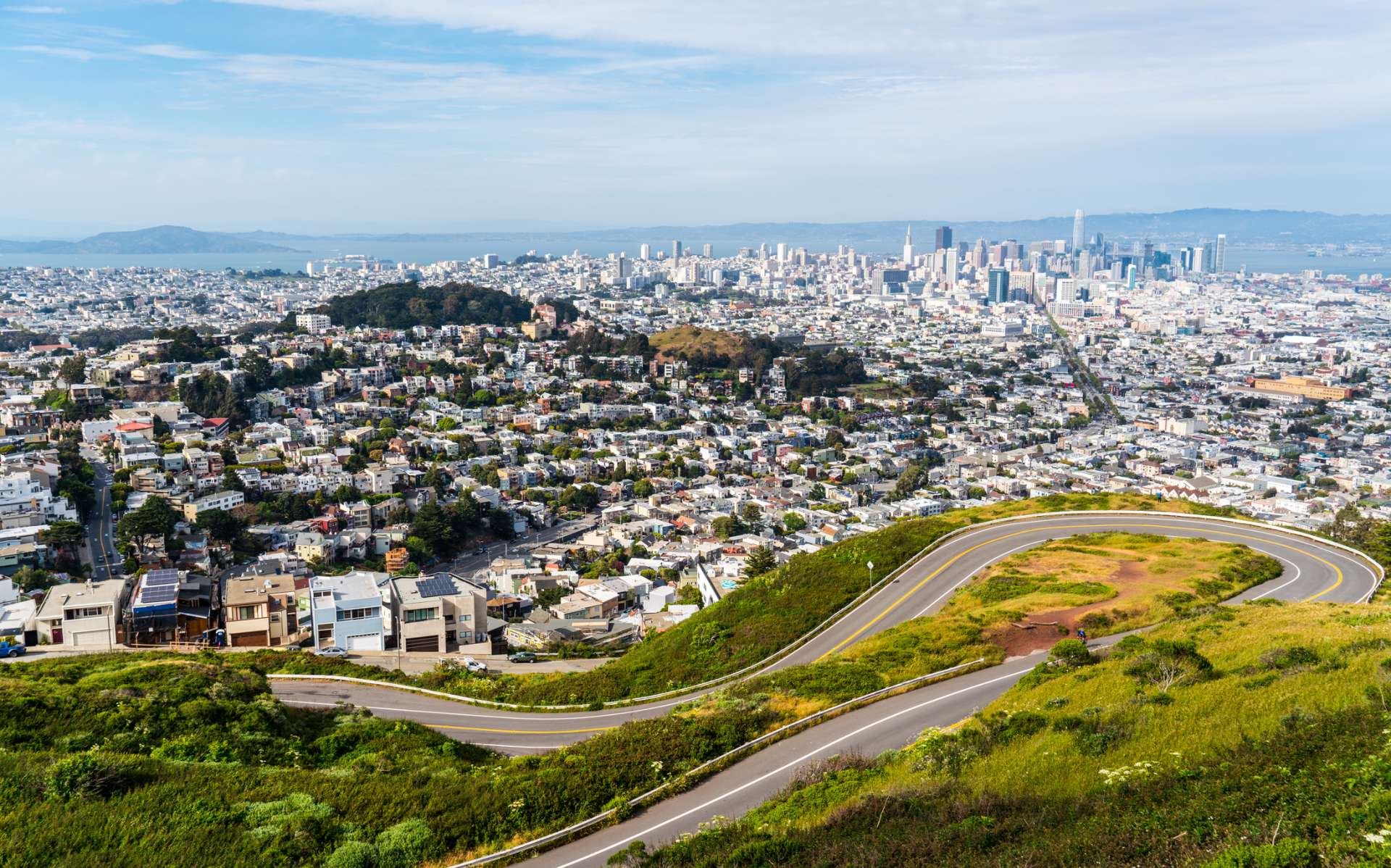 ラクダのこぶのような南北に連なる小高い丘の上からは、サンフランシスコの市街地をはじめ、ゴールデンゲートブリッジやアルカトラズ島までを一望することができます。