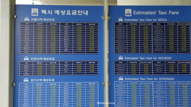 タクシー料金について説明します。仁川国際空港の第1ターミナル、第2ターミナルのタクシー乗り場の横には、大まかなタクシー料金が書かれた掲示板があります。そこに書かれた料金に、ソウルまでの高速道路通行料6,600ウォンを加算した料金がタクシー料金の相場になります。