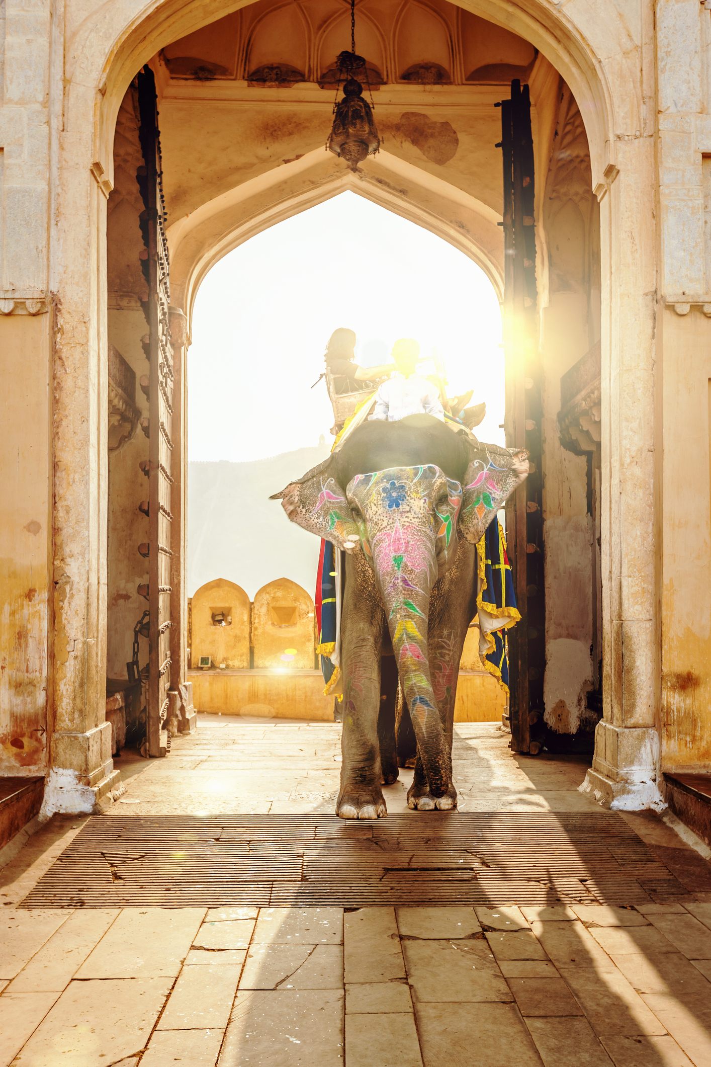 ゾウさんタクシーは初めは少し怖いけれど、慣れてくると快適。マハラジャ気分で門を通って宮殿に到着! 繊細な象嵌細工や銀細工がちりばめられたキラキラでゴージャスな宮殿は、見応えたっぷり。砂漠の民ラージプートの様式とインドのムガル様式が混ざった、独特の建築様式に注目してみましょう。