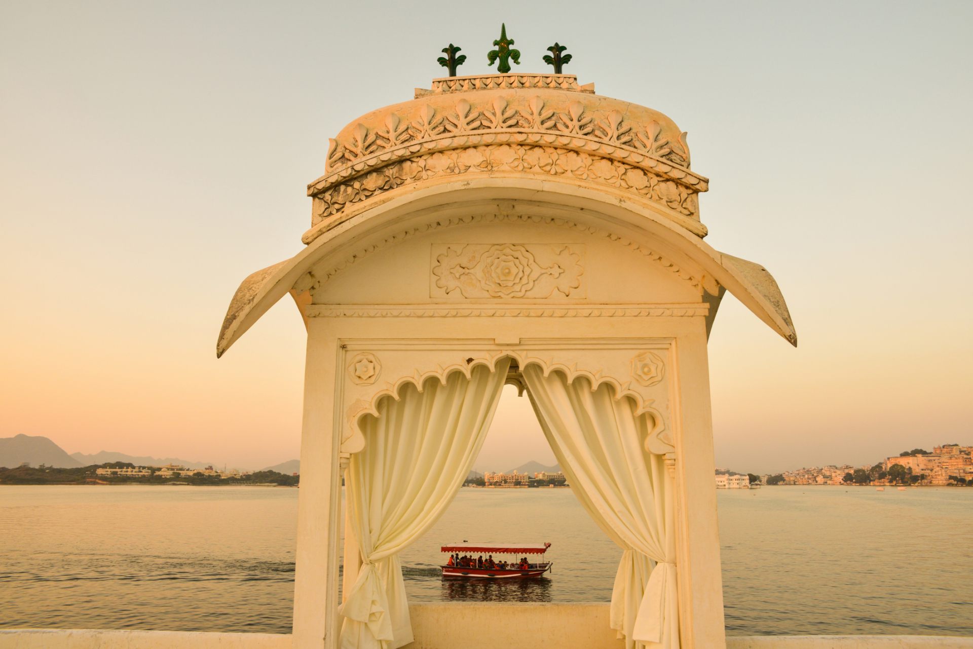 ラージャスターン州でもうひとつ注目したい街が古都ウダイプル。街の建物の色から“ホワイトシティ”と呼ばれていますが、ここで街以上に有名なのが、湖に浮かぶ宮殿ホテル「タージ・レイク・パレス」。マハラジャの夏の離宮として建てられたユニークな立地のホテルはぜひ一度は宿泊してみたい!