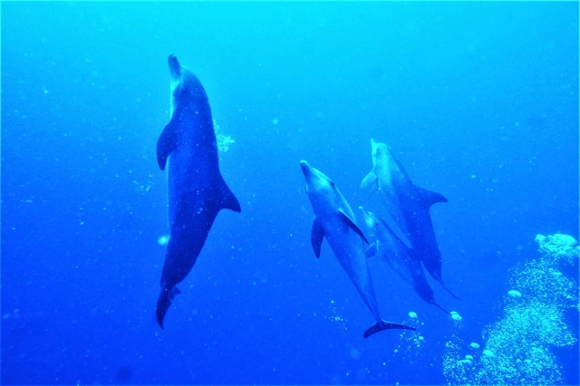イルカと泳ぐ時は、シュノーケルまたはスキンダイビング(素潜り)で一緒に遊ぶことになります。泳ぎが苦手でもボートについたロープに掴まって、海の中を見ているだけでもイルカが近くまで来たり、くるくる泳いでいるのを見ることができます。もちろん、素潜りが得意な人は同じ水深まで潜って、隣で泳ぐこともできます!