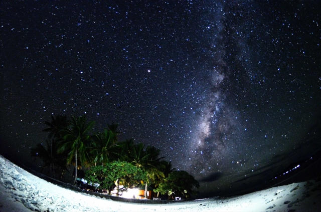 電気がほとんどないジープ島の夜空は、満点の星空。7月から8月は、天の川が綺麗です。イルカと一緒に泳いで疲れた後は、お昼寝して、夕飯を食べたら天体観測のはじまりです。