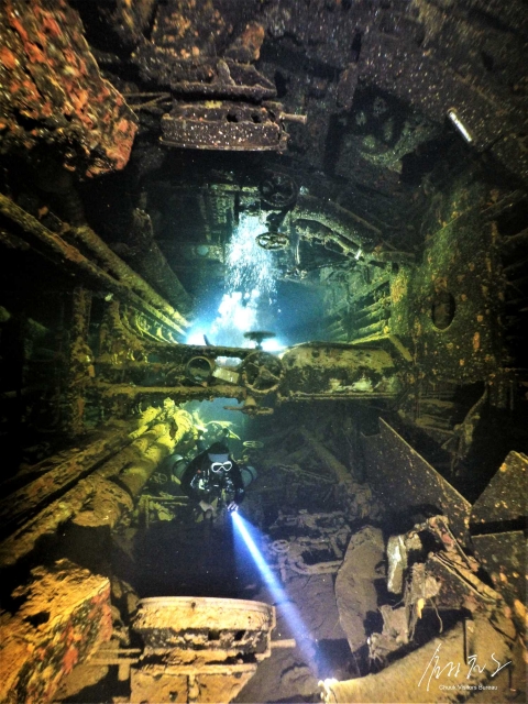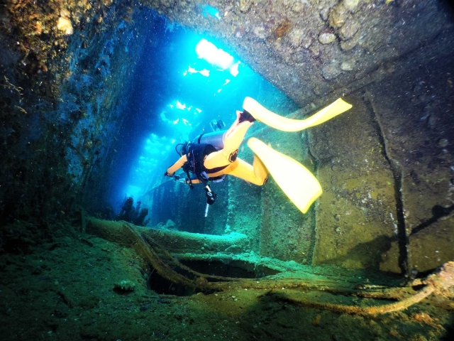 インストラクターと相談の上、ダイビングのスキルや保有ライセンスに問題なければ、船内探索をすることもできます。当時の生活や歴史を感じることのできる構造物や生活用品などを目の前で見ることができるのです。そこは、まさに水中歴史博物館のようです。教科書では学べない歴史を体感でき、とてもインパクトのあるダイビングができる貴重な場所なのです。