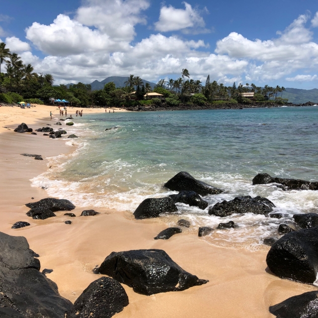 じつは、ハレイワ・ビーチパークが工事中だったのでさらに北上して偶然降り立ったビーチでの幸運な出合い。あとで調べたらこのあたりのビーチ(ラニアケア、バハイロアなど)はウミガメ遭遇率が高いのだそう。真水の出るシャワーはないし木陰も少ないので長時間の滞在には向かないけれど、クルマがあるならぜひ訪れたい。
