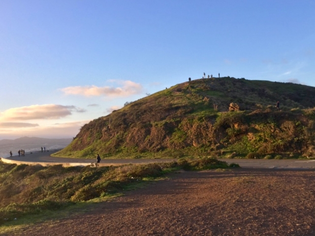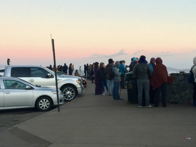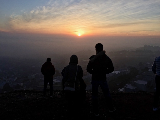 ふたつの丘から成るツインピークス。北側のユーリカ(Eurika)の頂上にポツポツと人影が見えます。朝7時頃から人が集まり、一眼レフのシャッターのタイマーをセットしたり、各々が静かに日の出を待っているようです。初日の出は、ベイビュー・ハンターズポイント地区のイーストベイオークランドの少し南側から昇ります。