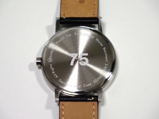 1944年にスイスのエンジニア兼デザイナーで、スイス国鉄職員だったハンス・ヒルフィカーが、SBB(スイス国鉄)の駅舎に設置する時計をデザインしてから今年で75周年。それを記念した限定モデルです。75周年記念ウォッチのベースとなったのは、1986年にモンディーン社が発売した「クラシックコレクション」。ステーションクロックのデザインをそのまま腕時計に落とし込んだ最初のシリーズで、見やすいデザインもさることながら、裏蓋に刻まれた「75」の数字も大いに心をくすぐられます。
