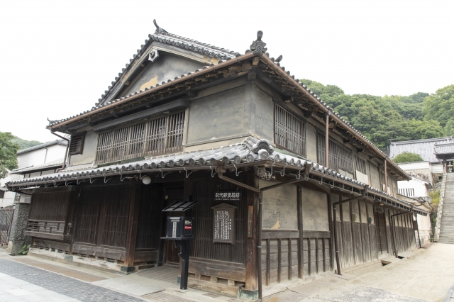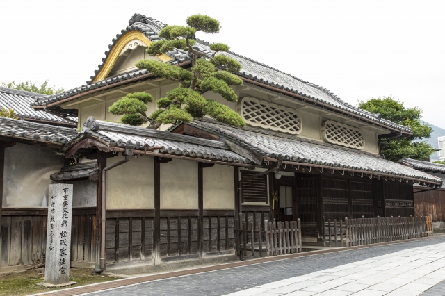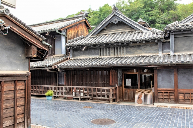 旧笠井邸を起点にして、本町通りを北に歩いて行きます。ニッカウヰスキーを創設した“マッサン”、竹鶴政孝氏生家の竹鶴酒造が右側に、そして、かつての塩田経営者だった松阪邸が左側に。さらに、進むとかつての郵便局だった上吉井邸というように、瓦葺の屋根と手の込んだ格子のデザインが美しいお屋敷が建ち並んでいます。みやげ物を扱う雑貨店、由緒ある建物の中にあるカフェなども、いにしえの風景に溶け込んでいる感じです。