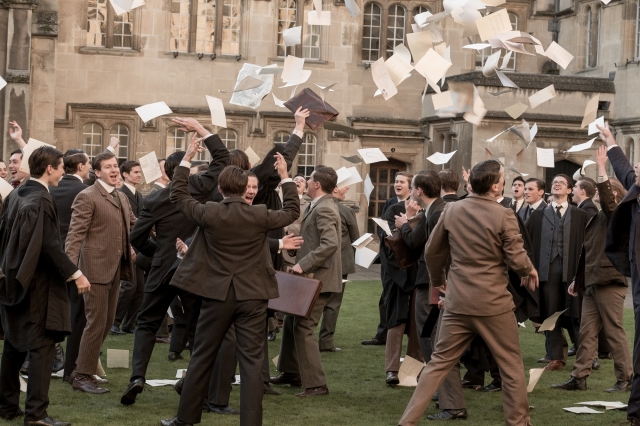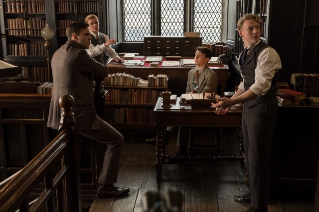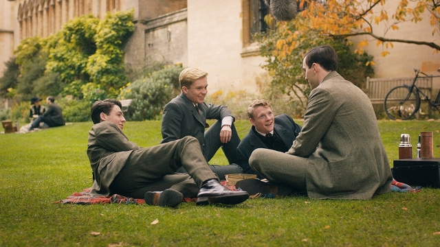 トールキンの学生時代は、図書館、研究室などで学問に励んだ後、夕食時に食堂に集合して友人達と談笑していました。トールキンは上流階級の子弟が通うバーミンガムの名門キング・エドワード校から、オックスフォード大学に入学。キング・エドワード校の同級生4人組のうち、彼とジェフリーはオックスフォード大学へ、クリストファーとロバートはケンブリッジ大学に進学しました。映画の中で学生の一人が第一次世界大戦の始まりを知らせるシーンでは、学生たちが芝生の上を歩いていますが、通常芝生の上を歩くことは禁じられています。戦争という特別な事態だったため許されたのだとのこと。