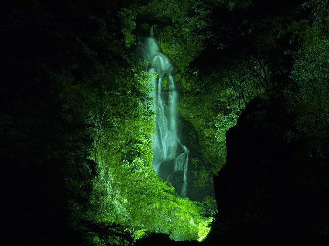 この写真は、「美作国建国1300年記念事業」でライトアップされた時の滝の様子です(数年に一度、このようなライトアップを楽しむことができます)。
