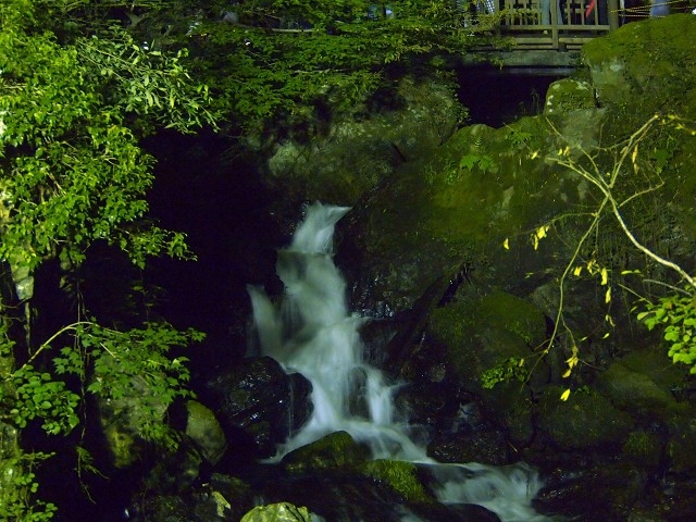 駐車場に車を停め、渓谷沿いに登り坂を歩き、入り口からさらに600メートルほど進むと滝全体が見えてきます。流れ落ちる姿は、ライトの光が霧のような飛沫をまとい幻想的です。