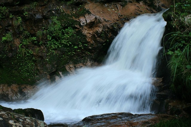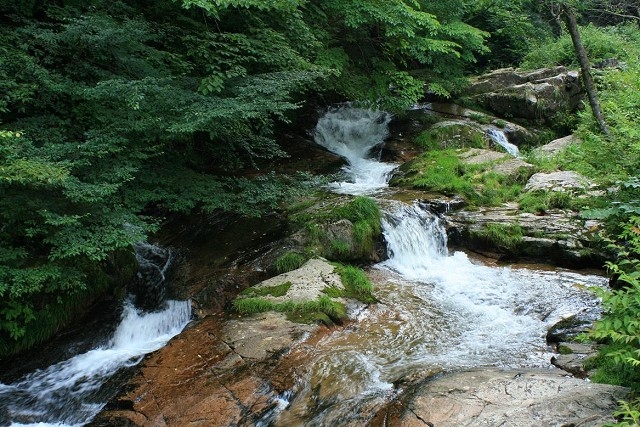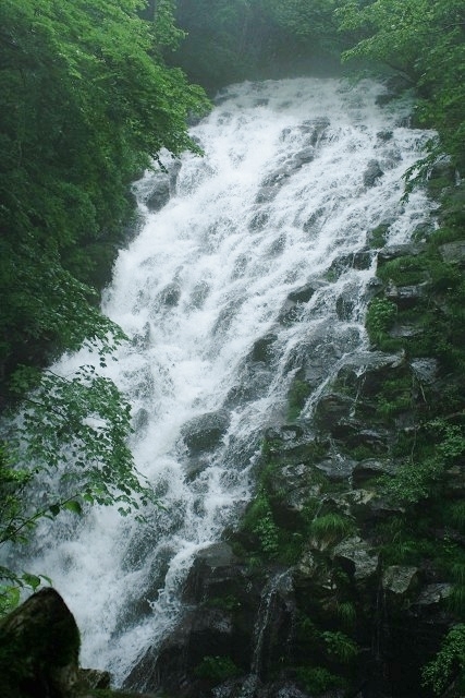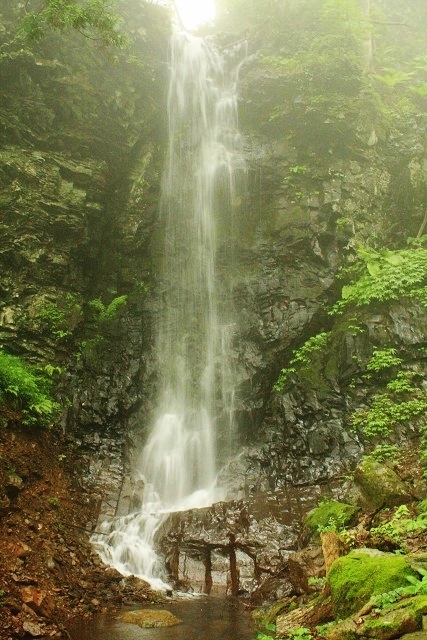 「布滝(のんだき)」は、標高900メートルの山々に囲まれた津山市にあります。氷ノ山後山那岐山国定公園に指定された黒岩高原の水を集め、急な滑り台のように落下する個性的な滝です。