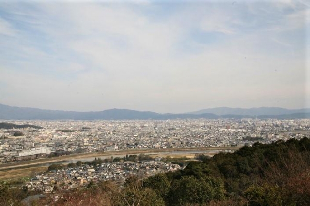 眼下には、嵐山を流れる桂川。遠くには、京都タワー、さらに奥には比叡山も見えます。標高160mから見る京都の風景は、別格です。これからの紅葉の時期は、さらに最高の眺望が期待できます。