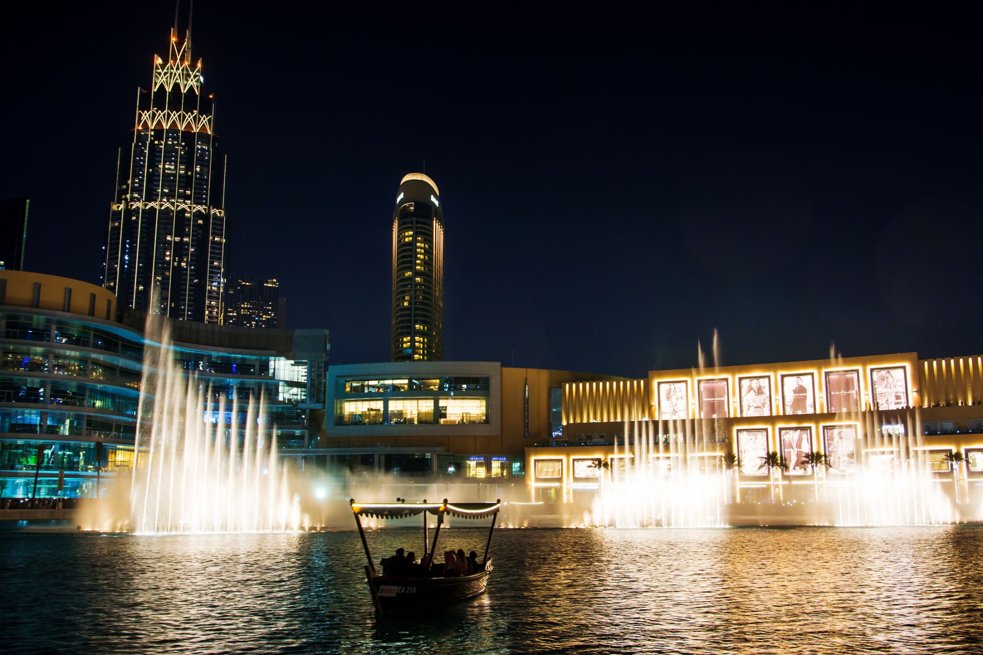 バージュ・ハリファ麓の人工池で毎日行われる、音と光と水が織りなす約3分のショーは必見。高さ150mまで吹き上がる噴水は大迫力!隣接するショッピング施設「ドバイ・モール」や「スーク・アル・ババール」内の、噴水ビューのレストランやカフェでゆったりと観賞するのがおすすめです。