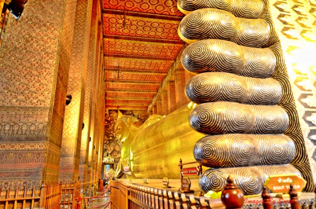 ワット・ポー(Wat Pho)は、巨大な涅槃仏が有名で、タイ式マッサージの総本山としても知られます。寝仏、寝釈迦像とも呼ばれる仏像は、全長46メートル、高さ15メートルの大きさを誇ります。足の裏には仏教の世界観を現した108の図が描かれています。