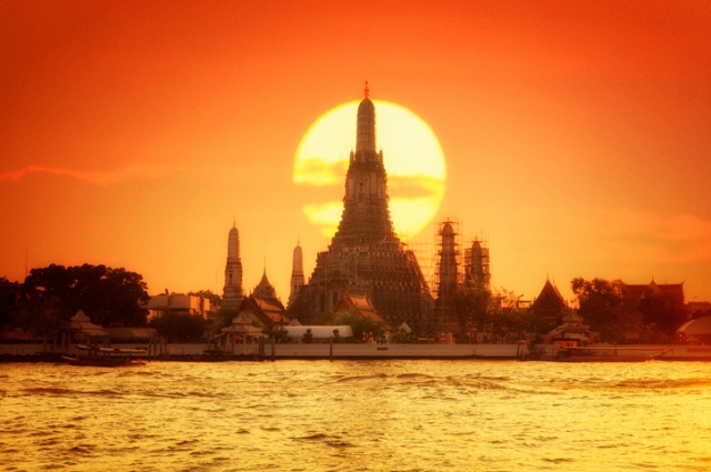 ワット・アルン(Wat Arun)は、チャオプラヤー川のほとりにそびえる大仏塔が有名な寺院です。アルンとはタイ語で「暁」を意味し、「暁の寺院」とも呼ばれます。大仏塔の表面には無数の陶片がはめ込まれ、タイの強い日射しを受けてキラキラと輝きます。