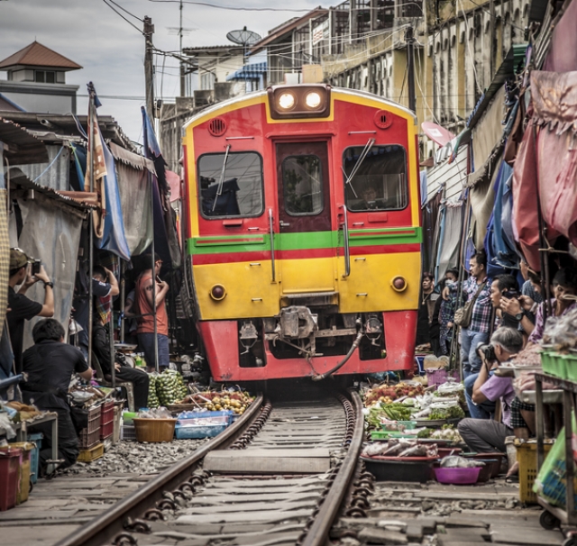 タイの珍百景といえば、線路の上にある市場、メークローン市場(Maeklong Market)でしょう。バンコクから南西に70キロメートルほど離れたサムットソンクラームにあります。折りたたみ市場の異名をもち、1日8回(4往復)、列車が通り過ぎるたびに日除けや商品棚が瞬時に片付けられ、列車が通り過ぎると何事もなかったように店が広がります。